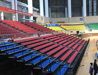 贵港体育中心综合馆总体可容纳5000人,其中伸缩看台1400位。伸缩看台分列长的两边,两边看台长约36米,看台为九层,观众可由二楼通道入场,下至一楼伸缩看台位置。比赛区和看台观众区由护栏隔离。