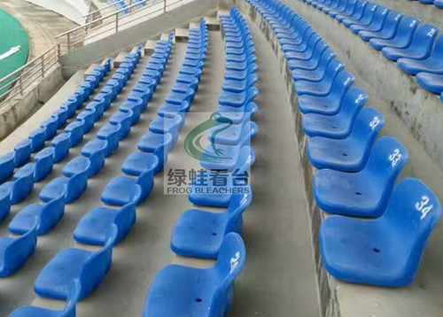 体育场看台采用全蓝色的中空吹塑中靠背固定座椅。