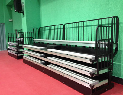 该看台为四层手动伸缩看台,看台采用绿蛙特有导轨结构,伸缩流程。看台整体采用亮光黑颜色,再配以金属原色的铝合金座板与铝合金封边条,形成强烈反差,并与羽毛球场地颜色相得益彰,整体美观大方。