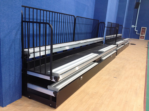 该看台为三层手动伸缩看台,看台采用绿蛙特有导轨结构,伸缩流程。看台整体采用亮光黑颜色,再配以金属原色的铝合金座板与铝合金封边条,形成强烈反差,并与羽毛球场地颜色相得益彰,整体美观大方。