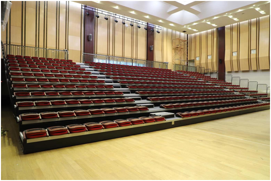 绿蛙看台为学术交流中心配置了前置式包绵软包座椅带扶手的电动伸缩看台,为满足客户特殊需求,在座椅背面还增加了网兜设计。配合交流中心庄严的设计,大气整洁的看台为这个“舞台”增添了又一种色彩。