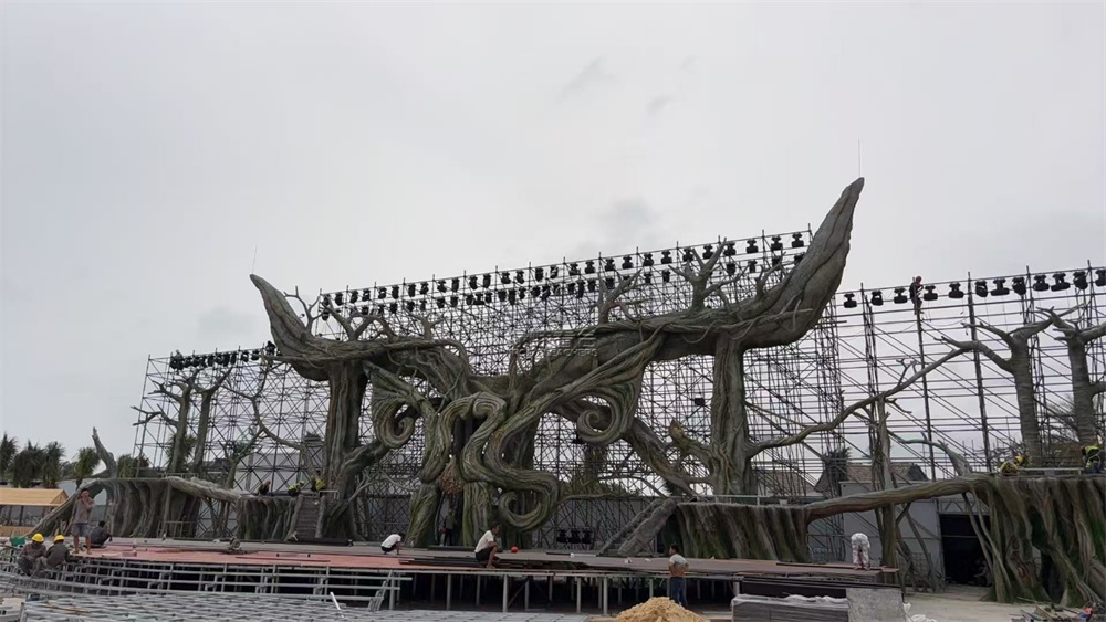 今年以来,运营方不断推陈出新,计划在此地推出大型实景演出《三亚夜未眠-沉浸式爱情部落》,为这座不夜城注入更多浪漫与艺术的元素。十月的海风轻拂,施工现场却是一片热火朝天的景象:舞台、灯光、音响和看台等各项设施正紧锣密鼓地进行着最后的布置与调试。工人们穿梭其间,细致地安装每一个部件,力求在演出开幕前,将这片区域打造成一个完美的艺术空间,让观众仿佛置身于一个梦幻的爱情部落。