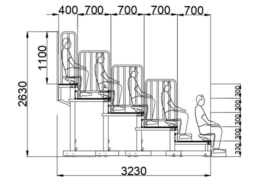 (2)看台整体为垂直支撑结构。看台层宽700mm,尾层宽400mm;首层高330mm,其他层高300mm。(伸缩看台为定制产品,可根据实际场地和客户需求,略微调整尺寸。)