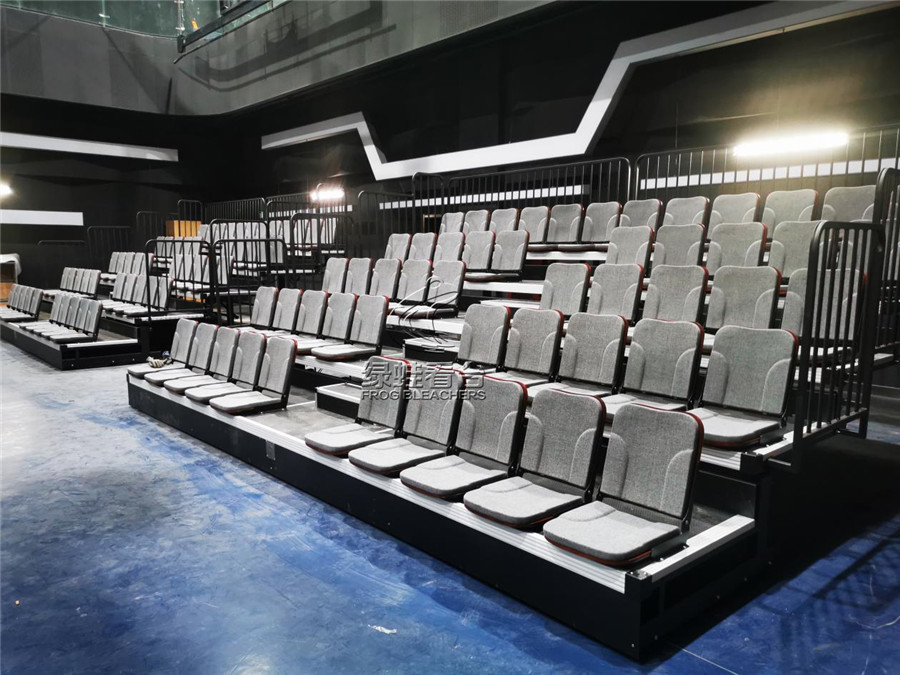 看台上需留出纵向疏散通道,通道应符合疏散要求。每层通道处, 安装一级踏步箱体,箱体采用 17mm 防滑舞台板,外形尺寸:1000mm×300mm×150mm,踏步外露的边均采用铝合金材料包边,外露的角用注塑护角包围,确保踏步箱体美观大方安全。
