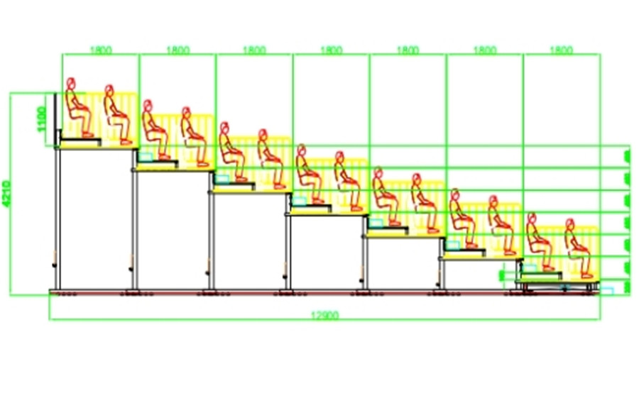 (2)看台整体为垂直支撑结构。看台层宽1800mm,一层摆双排后置式座椅,同一层双排座椅高差200mm,首层高330mm,其他层高400mm。